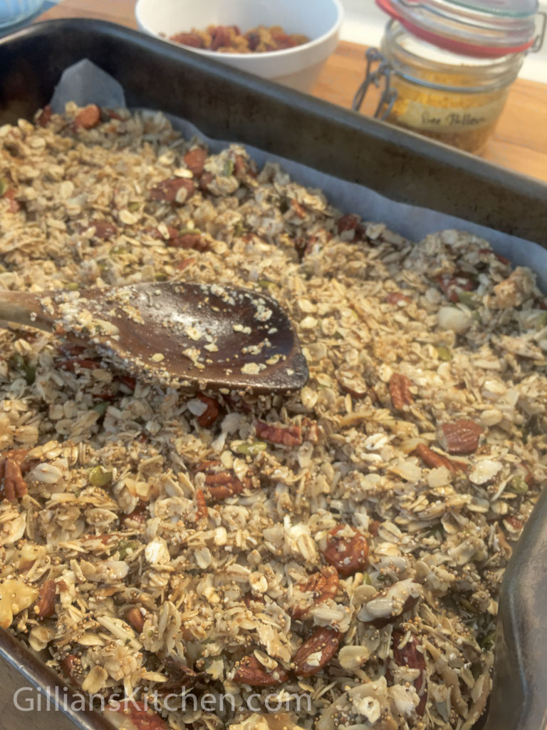 I am totally nuts about granola! For breakfast, most mornings, I eat a bowl of plain yoghurt sprinkled with granola, topped with blueberries, raspberries or banana, or all three if I’ve time to prepare.