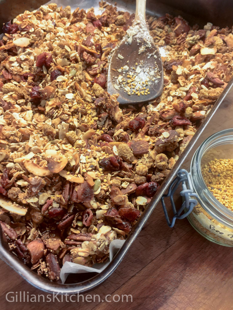 After toasting in the oven for about half an hour leave to cool before adding your choice of dried fruit. Again the choice is endless. I used dried cherries and white mulberries, the sourness from the cherries balanced out the sweetness of the honey and coconut shavings perfectly. I also added a smattering of bee pollen – just because it’s good for you and I had some lying around!