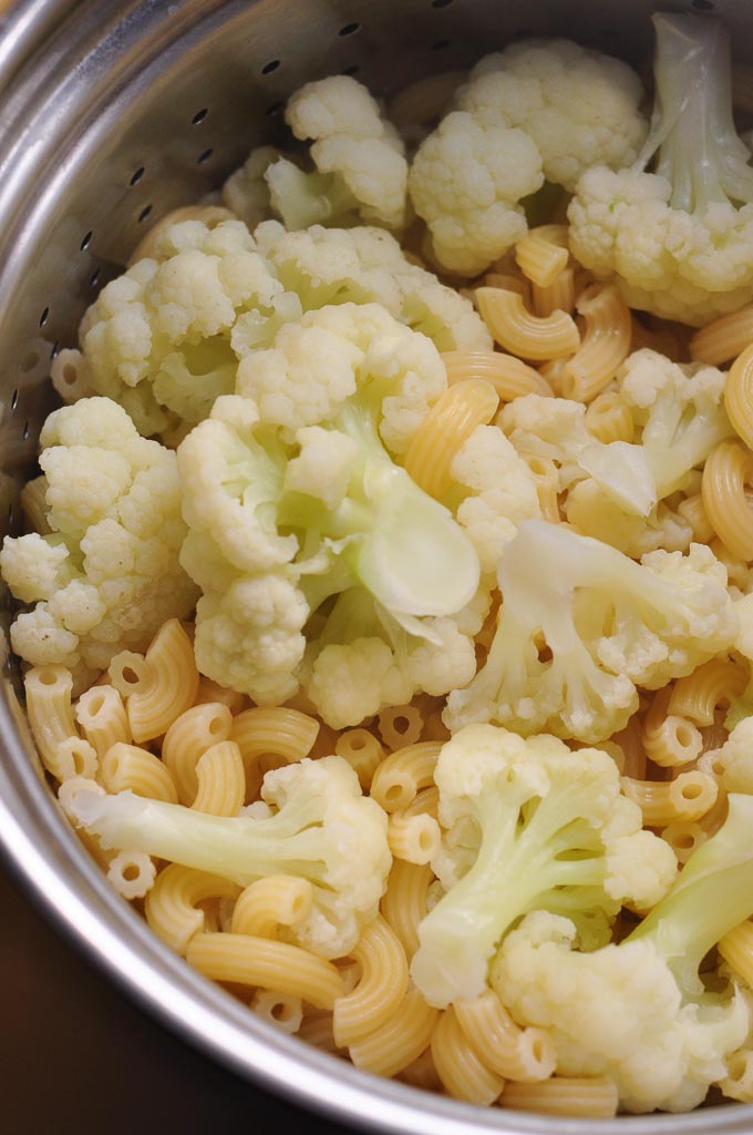 Cook the macaroni in a large pan of salted, boiling water, for 10 minutes, or until al dente. After five minutes add the cauliflower pieces. Don’t overcook as it will continue to cook in the oven later.